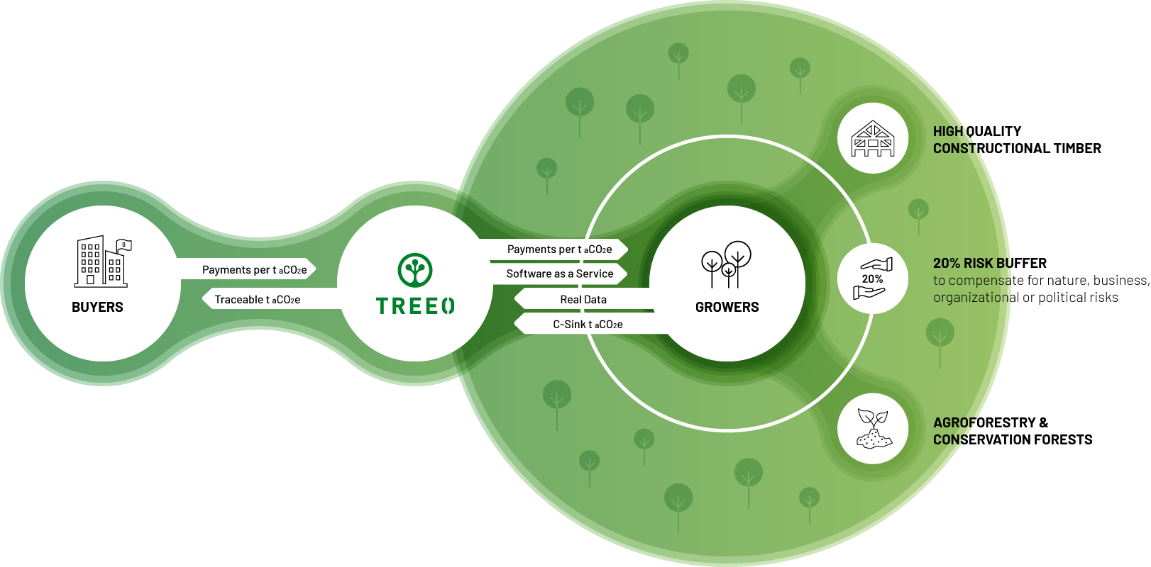 TREEO demokratisiert den freiwilligen Kohlenstoffmarkt, indem es Unternehmen mit wirkungsvollen Wiederaufforstungsprojekten im globalen Süden verbindet. TREEO ermöglicht es Millionen von Landwirt*innen ihr Kohlenstoffkapital zu nutzen und macht sie zu wertvollen Marktteilnehmern. Unternehmen erreichen ihre Klimaziele durch hochwertigen Kohlenstoffabbau.